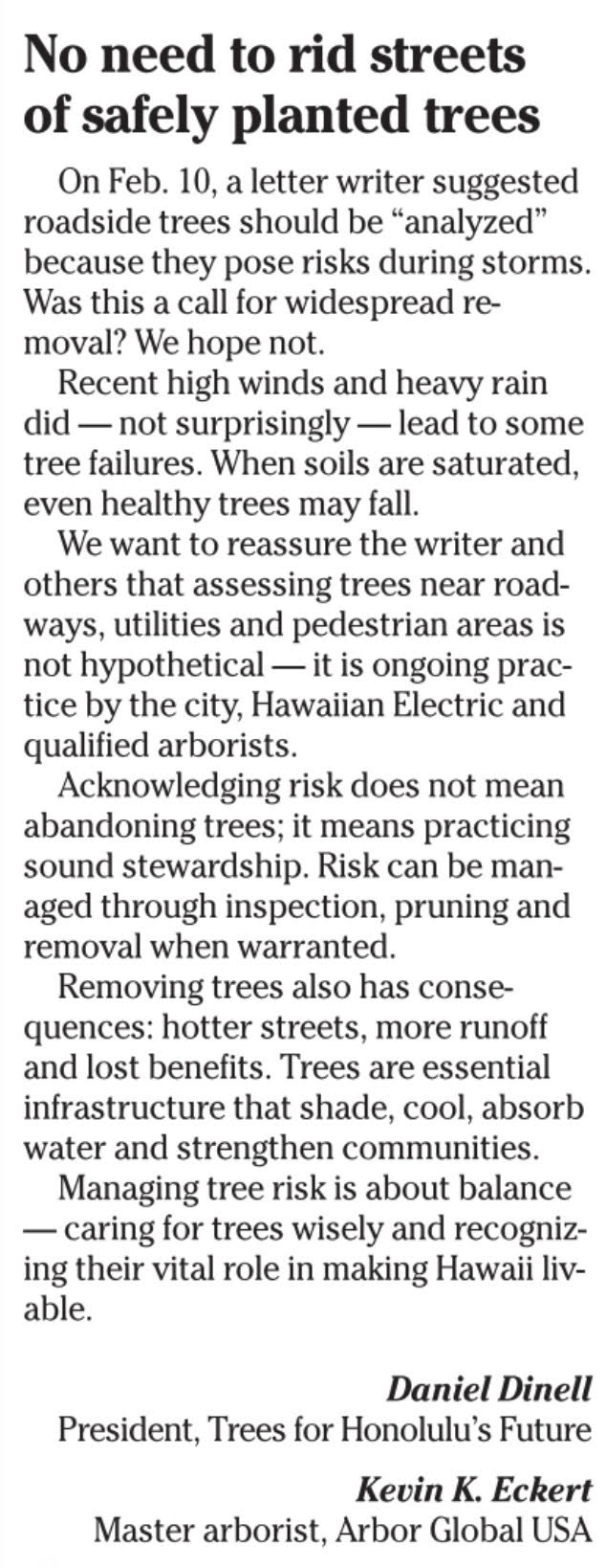 TFHF President Daniel Dinell and Panel of Adviser Member Lea Hong, Hawai’i director for Trust for Public Lands, jointly penned this Community Voices piece: “Loving Trees, Loving Parks: An Rx For Our Urban Areas” in Civil Beat. (2/19/2025)